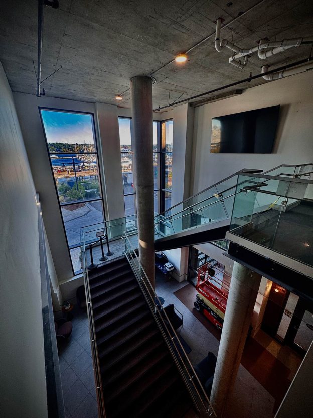 I wanted to share a photo Eli sent me of an impressive installation our team completed yesterday. Eli, Justyn, and Erik successfully installed a 125lb, 100-inch flat screen 25 feet from the floor for a new restaurant opening soon on the Bremerton waterfront.