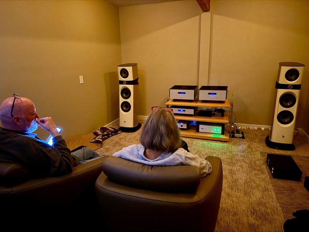 The final stage will be acoustic treatment. Cindy has chosen beautifully made quilts to manage mid- and high-frequency reflections. Their listening love seat should arrive in the next few weeks.